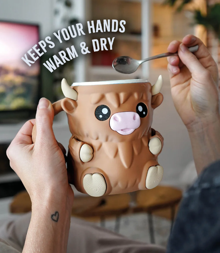 Ferdinand isn’t just a mug—he’s your dessert sidekick. This fluffy Highland Cow pint holder keeps your hands warm, your ice cream cold, and even hides a surprise spot for extra toppings or secret snacks. No more juggling spoons and napkins. Ferdinand’s got you covered.